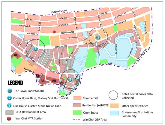 Location map of the urban revitalisation in Wanchai. Source: modified from outline zoning plan, the Planning Department, HKSAR.