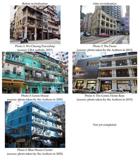 Established in 2001, the Urban Renewal Authority (URA, Hong Kong, China) aims to assist the Hong Kong government in revitalising the deteriorated urban environment [47]. Historic preservation has been increasingly emphasized in the process of urban renewal, particularly in the last two decades. The URA has employed the 4R strategy, that is; redevelopment, rehabilitation, preservation, and revitalisation, to regenerate the older urban districts. In past decades, the revitalisation of privately owned historic buildings has primarily been the role of URA, particularly, the Chinese tenement buildings (shophouses) while the Development Bureau has been in charge of publicly owned buildings. In addition to the URA, Revitalising Historic Buildings through Partnership Scheme was also launched by the Commissioner for Heritage Office (CHO, Hong Kong, China) of the Development Bureau, which was established in 2008 to oversee government owned historic buildings [48].