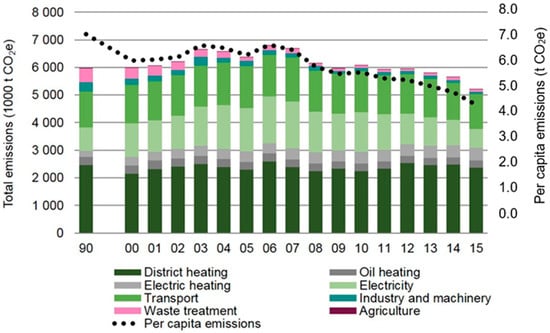 33]. For example, in terms of food consumption, Helsinki and Istanbul have similar ecological footprints, at about 1.5 and 1.2 global ha/cap, respectively. The biggest difference is in the carbon footprint, which is almost three times bigger in Helsinki. Interestingly, Istanbul’s ecological footprint remained constant in the period of 2010–2015, whereas Helsinki managed to reduce its GHG emissions, from almost 4000 to below 3500 kt carbon dioxide equivalent (CO