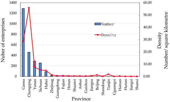 As shown in Figure 4 and Figure 5, the olive enterprises in China are mainly distributed in Gansu, Chongqing, Yunnan, Sichuan, and Hubei. All of the top five provinces have 2388 enterprises, accounting for 97.11% of the total throughout the country. There are 1290 olive enterprises in Gansu province, accounting for 52.46% of the total, showing a strong regional concentration. There are 460 enterprises in Chongqing, accounting for 18.71% of the total. With a larger amount of registered enterprises than Sichuan and Yunnan, Chongqing has become one of the important regions in the olive development. The density of enterprises in Chongqing is 55.89/km2, which has exceed the record of Gansu (28.39/km2), ranking the first in China. The distribution of the enterprises has a strong consistency with the cultivated area and the amount of fruit production, which indicates that due to the olive fruit needing to be processed in time after its harvest, the related enterprises are mostly distributed in their planting and producing areas when facing the lack of cold storage for fresh olive fruit in China.
