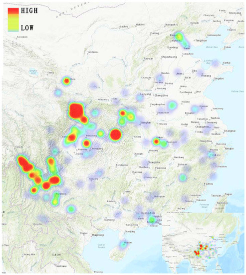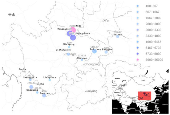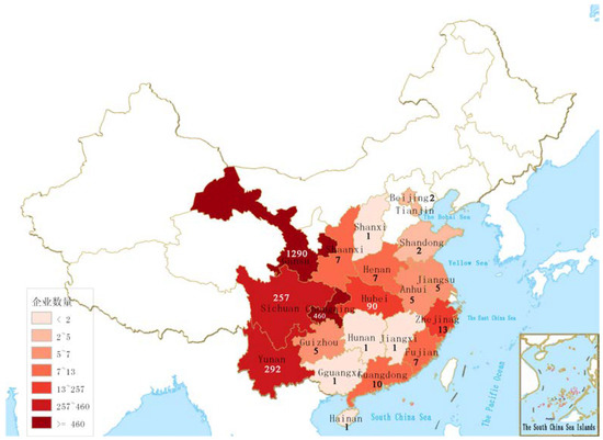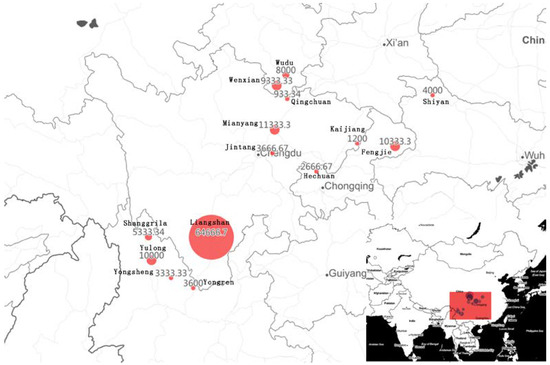 The registered addresses of the enterprises were converted to latitude and longitude, and the converted data were presented in a scatter point through the GeoHey GIS software (https://geohey.com/) and visualized by the thermal map. The results are shown in Figure 6 and Figure 7. The geographical distribution of the olive enterprises is both extensive and concentrative, and has the following characteristics: (i) olive enterprises have been distributed in the 21 provinces, municipalities, autonomous regions, and chartered cities in north and south China. (ii) nine centralized hot areas of olive development have been formed in China, they are (1) Lanzhou, Gansu; (2) Longnan, Gansu and Guangyuan, Sichuan; (3) Chengdu and Mianyang, Sichuan; (4) Nanchong, Sichuan and Chongqing main city; (5) Northeast of Chongqing; (6) Lijiang and Diqing, Yunnan; (7) Chuxiong, Yunnan; (8) Liangshan, Sichuan; and (9) Shiyan, Hubei. Among them, Lanzhou, Chengdu and Chongqing are large cities; the other regions are located in the Qinba mountain area, Jinsha river dry hot valley, Sichuan hilly area, and other poverty-stricken or minority areas. (iii) Enterprises in Lanzhou and Chengdu are more concentrated. Enterprises in Chengdu are mainly concentrated in the main urban area and the Jintang County, located in the east of Longquan Mountain. Enterprises in Lanzhou are mainly concentrated in its main urban area too. Compared with other capital cities such as Kunming, Wuhan, and Chongqing, the number of enterprises in the above two cities is obviously higher. In recent years, the development of enterprises in Mianyang, Deyang, and Ziyang near Chengdu has also been rapid, which has become the representative of the olive industry in a megacity city and its surrounding areas. In the above 9 areas, olive companies are further concentrated in 11 places. They are Longnan of Gansu; Shiyan of Hubei; Mianyang, Panzhihua and Liangshan, Guangyuan, Dazhou, and Chengdu of Sichuan; Lijiang, Chuxiong, and Diqing of Yunnan; and the province-level municipality of Chongqing. The distribution of the olive enterprises in the above 11 areas is shown in Table 6.