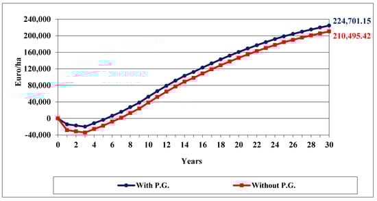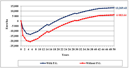 In this case, AGM would reach a negative value of −380.29 €/ha for a 10% sales price decrease and of −346.96 €/ha for a 10% annual costs increase. However, in the presence of public grants, investments would have an almost nothing profitability, with an AGM value of 13.33 €/ha (−10% sales price) and 86.01 €/ha (+10% costs).