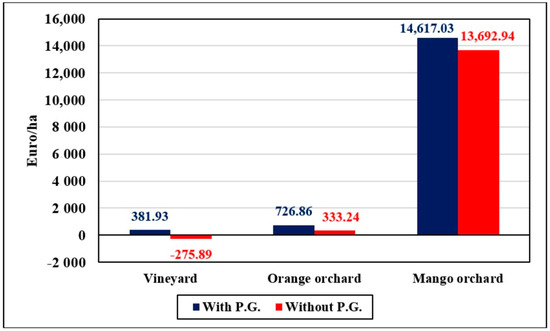 Among crops, mango showed the highest profitability, both with and without public grants, with a value of AGM equal to 14,617.03 €/ha and 13,692.94 €/ha, respectively (Figure 4).