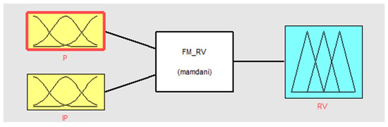 The fuzzy logic toolbox in Matlab was used for the fuzzy model creation. The fuzzy model of risk value evaluation (FM_RV) consists of two input variables (P—Probability, IP—Impact on the Project), one rule block, and one output variable (RV—Risk Value) (see Figure 2).