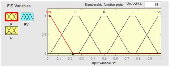 Figure 3 shows the input variable P with five linguistic fuzzy values: VH—very high, H—high, M—middle, L—low, and VL—very low. The membership function of type Π (trapmf) and range [0; 1] was used to create the fuzzy model. The input variable IP has the same parameters.