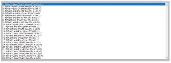Figure 4 shows the output variable RV with five linguistic fuzzy values: VH—very high, H—high, M—middle, L—low, and VL—very low. The membership function of type Π (trapmf) and range [0; 1] was used to create the fuzzy model.