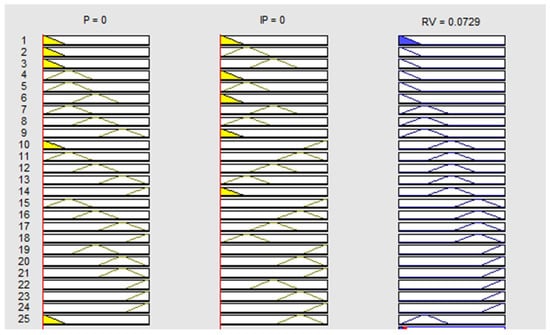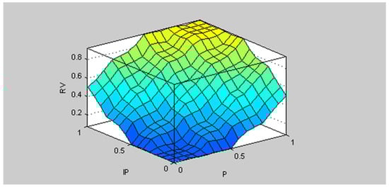 Figure 6 shows the dependence between input and output variables. It is a function of RV = f (P, IP). The coordinates [0; 0] represent the following situation: If the input variables P and IP are very high, then the output variable RV is very high. The coordinates [1; 1] represent the following situation: If the input variables P and IP are very low, then the output variable RV is very low.