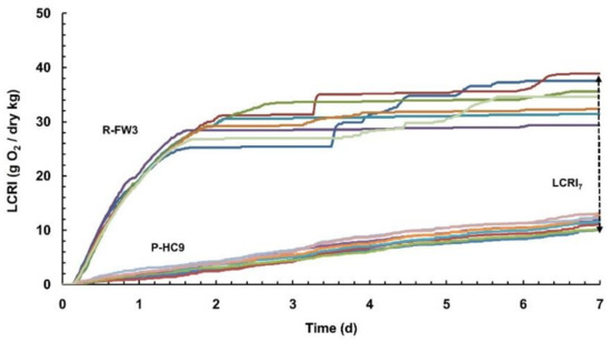 Typical cumulative oxygen consumption profiles from the manometric liquid phase test are included in Figure 1. Solid lines represent the seven replicates for a raw (R-FW3) and the eight replicates for a processed (P-HC9) substrate. Oxygen consumption for raw materials (e.g., R-FW3) starts immediately after the initiation of the experiment, without any lag phase. Raw substrates had higher O2 consumption rates during the first 2 days and lower rates thereafter until 7th day. On the other hand, in the processed substrates (e.g., P-HC9) the consumption curves were flatter and lower than the raw materials. The same graphical trend for different substrates has been also found in other studies that dealt with solid phase static stability methods using manometric principles [6,28].