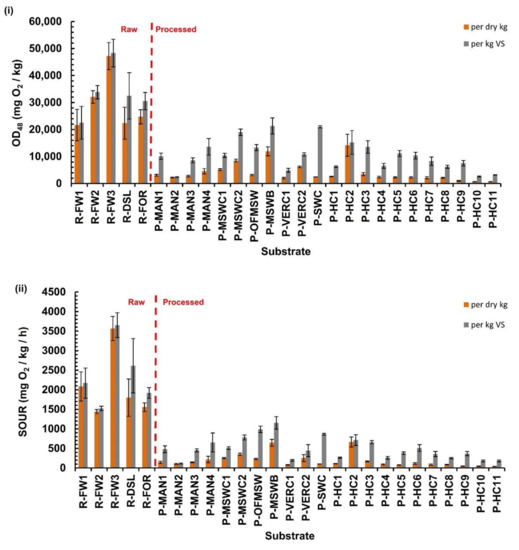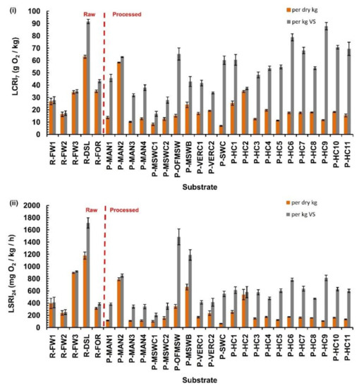 The same trend is evident in Figure 2ii, which depicts the oxygen consumption rate over 24 h rate (LSRI24) of the manometric test, expressed both in a per dry kg basis (orange bars) and in a per organic matter kg basis (grey bars). The highest LSRI24 values were attributed to the dewatered sludge (1179 mg O2/dry kg-h or 1714 mg O2/kg VS-h) and the food waste (897 mg O2/dry kg-h or 920 mg O2/kg VS-h). On the other hand, most of the processed substrates had values below 200 mg O2/dry kg-h.