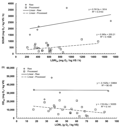 Figure 4 graphically depicts the correlations among the biodegradation indices for each of the two liquid tests. Correlations were checked among rates (Figure 4i) or among cumulative values (Figure 4ii) separately for the raw and processed substrates. As demonstrated, a graphical positive correlation trend exists only for the rate indices, namely the SOUR and the LSRI24 (Figure 4i). On the other hand, no significant correlation was found between the cumulative indices of the two tests (Figure 4ii).