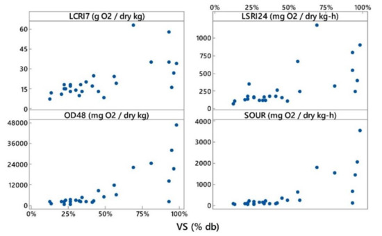 Α correlation was calculated using the average values of all indices per material used and the initial chemical characteristics of all substrates (VS, C, N). The sample size in this case was n = 27. The Spearman correlation coefficients (ρ) were chosen here since they can reveal any type of correlation and not only the linear one, as in the case of Pearson coefficient. The Spearman’s ρ coefficient among LCRI7-VS, LSRI24-VS, OD48-VS and SOUR-VS ranged from 0.67 to 0.76 and were all statistically significant at p < 0.05. Despite the above statistical finding, the graphs below reveal that those correlations are not very strong in the high values of VS (see Figure 5). For example, the graph of OD48 and VS reveals that there were at least 5 samples with a VS content of more than 90% db that had corresponding OD48 values between 200 to 48,000 mg O2/kg VS. This is not an indication of a strong correlation despite the fact that the corresponding Spearman correlation coefficient was 0.723 and statistically significant at p < 0.05 for that pair of variables. Other researchers [4,29] have also not found significant correlations between volatile solids and static respiration indices. For example, Bayard et al. [30] found that neither organic matter content nor cellulose and hemicellulose contents were correlated to the results of bioassays that assessed biodegradability via respiration activity. That is, organic matter content alone cannot be an adequate predictor of respiration activity, since it can contain both readily degradable and non-degradable organic matter. This is in agreement with the findings of Evangelou et al. [7] too, who had used solid-phase static respiration activity tests.
