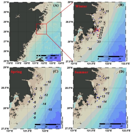 Water samples were taken during three cruises. Due to the strong winter wind, it is difficult to collect the samples from the bottom (3 m above the sea bed). Therefore, only the surface water samples of 24 stations were collected on 13–15 January 2017 (2 m beneath the sea surface) (Figure 1B), and both surface and bottom seawater samples of 15 stations were collected on 11–13 May and 9–11 August 2017 (Figure 1C,D), aboard the research vessel Zheluyuyun No. 88009.