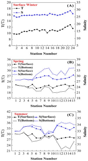 The lowest temperature appeared at surface in winter (9.70–12.78 °C), as with salinity (24.78–29.34) (Figure 2A). In spring, the temperature and salinity at the surface were 20.35–22.51 °C and 27.89–30.56, whereas those at the bottom were 18.06–22.02 °C and 27.92–34.39, respectively (Figure 2B). In summer, the seawater became warmer (surface: 27.32–30.84 °C; bottom: 21.99–30.74 °C), while the salinity is obviously lower at the surface (32.47–33.88) compared with bottom (32.47–34.36) (Figure 2C).