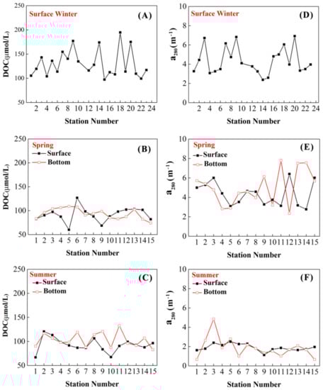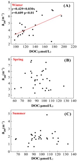 There was variable seasonal relationship between DOC and CDOM during winter, spring, and summer. In winter, it was not difficult to find that a280 was correlated positively with the concentrations of DOC (Figure 6A), which also could be found at the Changjiang River estuary [43] and some other areas [53], indicating that CDOM was an important component of the DOC, and they probably had some common mechanisms for controlling their distributions. However, the lack of relationship between DOC and a280 in the spring and summer implied that the CDOM is not a constant component of DOC and could not be the only dominating factor for the variation of DOC (Figure 6B,C). The primary factor contributing to the fluctuating correlation may be the various sources of DOC. In other words, non-colored dissolved organic matter was a part of the labile DOC and had a vital influence on the distribution of CDOM [56]. The relationship between DOC and a280 is susceptible to the change of environmental factors. In the summer, the mixing of water masses is obviously different from that in the winter. CDOM might be degraded by photochemical processes and microbial activities resulting in some non-absorbing CDOM under intense light [57]. It can be seen from comparing the a280 and DOC of different seasons that the Changjiang River waters may be responsible for the increased a280 and DOC in the winter.