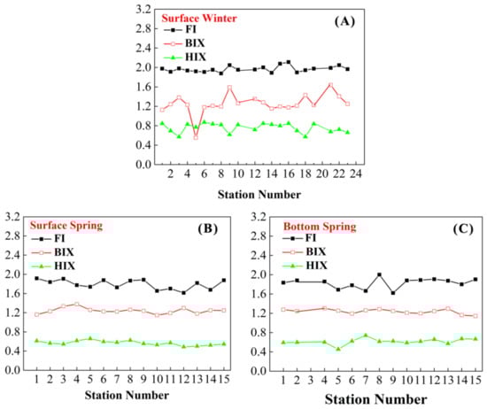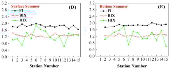 The values of FI were calculated in winter (surface: 1.88–2.11), spring (surface: 1.61–1.92; bottom: 1.62–2.00) and summer (surface: 1.64–1.99; bottom: 1.75–2.01), respectively (Figure 4). All of the values of BIX were above 1.00 except for one abnormal point (winter: station 5). The values of HIX, which showed obvious fluctuations at surface (0.62–1.91) and bottom (0.61–1.79) in summer, were less than 1.00 in winter (surface: 0.57–0.87) and spring (surface: 0.49–0.66; bottom: 0.45–0.74).