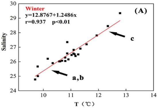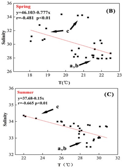 Temperature–salinity diagrams in different seasons were used to identify the source of seawater. As was shown in Figure 5A, there was a strong positive correlation between temperature and salinity in winter. However, the measured results in spring and summer were negatively correlated (Figure 5B,C). The results implied that three end members including coastal-current water from the Changjiang River (low temperature and low salinity), mixed water in the shelf area (low temperature and low salinity) and the Taiwan Strait water (high temperature and high salinity) might be mixed. Furthermore, coastal-current water in the three sections was dominant because of the prevailing northeast monsoon in winter [49,50]. In spring and summer, the temperature of coastal-current water, which probably was affected by the warming of the mainland, was higher than that of mixed water in the shelf area, and the temperature of the Taiwan Strait water was relatively low. The correlation was stronger in summer and the vital factor might be the Taiwan Strait water under the influence of strong southwest monsoon [51]. The above hypothesis was consistent with the the previous reported results at this area [49,50]. The seasonal variations of the correlation between temperature and salinity were similar to that of the Taiwan strait [52].