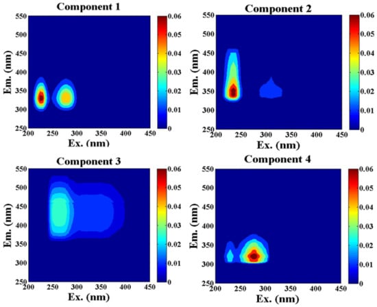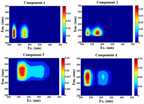 Recently, excitation emission matrix spectroscopy (EEMs) with its simple, sensitive and relatively inexpensive advantages was employed to determine the composition, structure and sources of DOM by peak picking method, and was regarded as the most effective technique due to the florescence properties of DOM [17]. So far, eight general types of fluorescence peaks have been identified in natural waters [18]. This provides a wealth of information on changes in DOM resulting from the mixing, biological processes, and photobleaching that occur in the aquatic environment [19,20,21]. EEMs has been extensively used to identify fluorescent components in seas, rivers and lakes because of the specific spectrum obtained from each known fluorophore [22,23,24]. Nevertheless, not all of the fluorescence peaks can be identified visually, such as the spectra of the underlying fluorophores owing to peaks stacking with each other in EEM and the complexity of DOM, leading to some inaccurate results or data waste [25]. To solve this problem, Stedmon et al. firstly used parallel factor analysis (PARAFAC) by decomposing the EEMs of complex mixtures into independent fluorescent components to obtain more accurate results [26]. The combination of EEMs and PARAFAC analysis could provide detailed fingerprint information from EEM and has been attracting attention as a reliable method which is better than the traditional peaking method. Now, the method of EEM-PARAFAC has been widely applied in the identification of DOM, and its applications have been reported by a large number of studies [4,22,27,28].