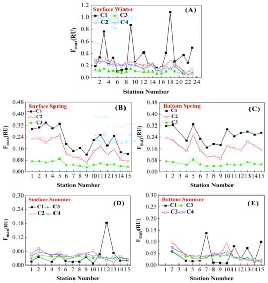 Obviously, the intensities of protein-like components (C1, C2 and C4) were higher in the winter than in the summer in this study area (Figure 9). Terrigenous input might explain the results, since the Changjiang River has a significant influence on the distribution of CDOM in the ECS [59]. In addition, probably due to the heavy wind and the synergistic effects by wind and tide in winter, sediment resuspension and desorption of DOM in this study area are also noteworthy factors. However, photochemical degradation in summer is easy to occur under intense light condition owing to the special photochemical properties of CDOM, and the active organic matter could be utilized by microorganisms [58]. Furthermore, an increase in salinity in this study area could account for the invasion of the Taiwan Strait water with low CDOM in summer. Meanwhile, the strengthening of DOM flocculation and sorption could raise the transparency of seawater. All of these factors probably resulted in the decrease of fluorescence intensity. A similar situation appeared in the North Aegean Sea due to photodegradation and sedimentary processes [60]. Compared to the winter, fluorescence intensity of spring showed a little reduction (Figure 9B,C), that may be due to the weak invasion of fresh seawater.