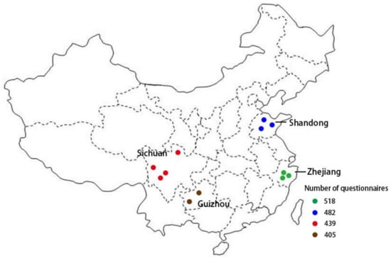 In our survey, Zhejiang Province, Shandong Province, Guizhou Province and Sichuan Province were selected as the target regions. Zhejiang Province, with a population of 56.6 million and covering 40,733 square miles, is the most developed area of the Internet in China and has witnessed economic prosperity that the Internet advancement brings [52]. As the province with big population and strong economy, Shandong’s GDP ranks third all over the nation [53]. Hunan and Guizhou belong to developing regions in the Midwest of China [54,55]. The specific geographical distribution of the questionnaire is shown in Figure 1.