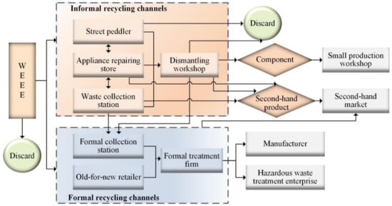 In China, the volume of WEEE is growing at a rate of 20% per year [56]. Appropriate collection methods are as the premise of reutilizing resources of EOL products. On the basis of classification of collection channels, we conclude the flow path of WEEE by the public survey, field research and information search on the Internet, as shown in Figure 2. In the following, we elaborate collection entities of informal recycling channels and formal recycling channels, respectively.