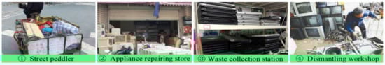 At present, the main informal collection entities in China are street peddlers, appliance repairing stores, waste collection stations and dismantling workshops, as shown in Figure 3.