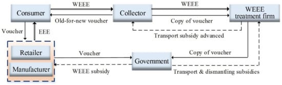 “Old for new” refers to EEE replacement scheme whereby consumers receive subsidy for buying new products including TWARC if they resell the same sort of used ones to stores, namely, old appliances are as discount coupons. On 28 June 2009, the Measure for the Implementation of “Old for New” Policy for Home Appliance was promulgated [60,61], its implementation process is as follows: After consumers resell EOL products to a retailer and get an “old-for-new” voucher from the collector who are sent to collect the old products by the retailer, they can buy a new electric and electronic product at a lower price by the voucher. The retailer get subsidy from the government with sales invoice and “old-for-new” voucher and give a part of the subsidy to the manufacturer. WEEE is transported to and handled by WEEE treatment firm who should advance the transport subsidy to collectors and submit voucher to the government. After checking the voucher, the government subsidize the treatment firm for transporting and dismantling WEEE [62,63]. The operating process is presented in Figure 4.