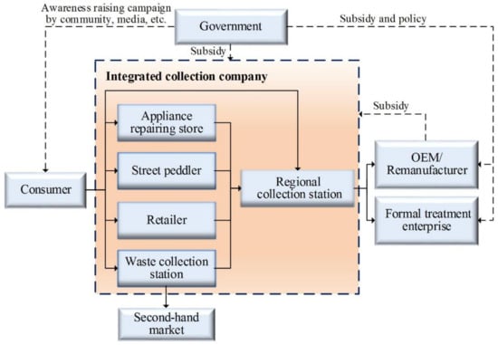 The early implementation of this mode needs policy support and subsidy from the government. When OEMs and remanufacturers receive WEEE, they subsidize the integrated collection company for collection and transportation cost, followed by which, the enterprises (OEMs, remanufacturers and formal WEEE treatment companies) apply to the government (e.g., Ministry of Finance) for subsidy through submitting invoices. This subsidy form was applied in “old-for-new” activity in China from 2009 to 2012 [66]. Besides, the government is supposed to subsidize integrated collection company whose construction and running in the beginning stage takes much capital.