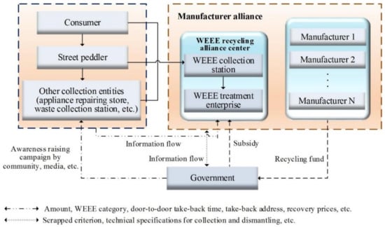 EPR requires that producer be not only responsible for production but also the product’s entire life cycle, especially for collection and disposal of the EOL [67]. In this mode, EEE manufacturers in manufacturer alliance are responsible for their product’s entire life cycle including production, collection and treatment.
