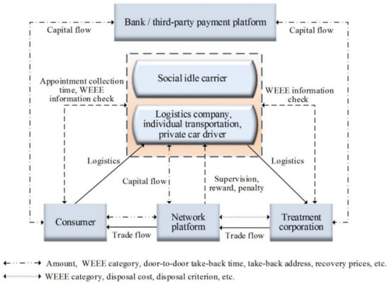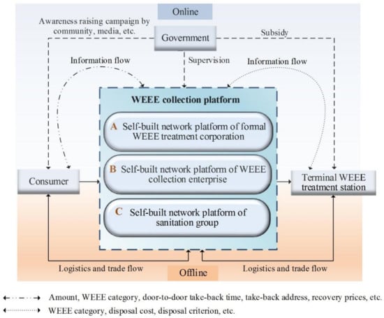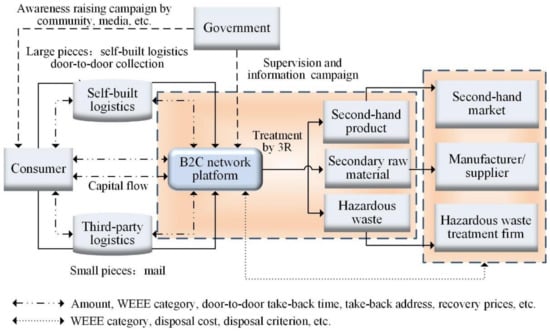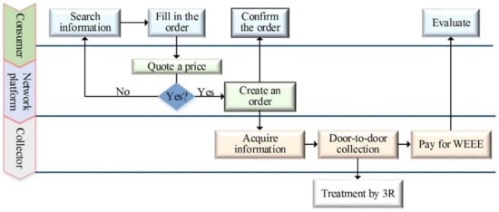 Most national laws and regulations on WEEE are about recycling that covers collection, dismantling, disposal and (re)manufacturing of end-of-life (EOL) products. As collection is the first recycling step that involves in the source and treatment method of WEEE, collection system plays a vital role in the whole recycling chain so that numbers of countries and regions are enthusiastic in promoting WEEE collection activities. In Germany, classification collection is well implemented by separating WEEE from household wastes and putting them into special containers or giving to municipal collection sites. For convenience, some municipal administrations also provide door-to-door collection service with a little charge [33]. The WEEE recycling system of Switzerland is based on EPR principles [23]. Every appliance retailer is a collection point which consumers can return the old appliances to and then the retailers deliver collected WEEE to the manufacturers for treatment [34]. To sustain the recycling system, when purchasing new products, consumers take the initiative to pay advanced recycling fees (ARF), some of which are for collection points establishment [35]. Similarly, in Japan, consumers are obliged to pay the transportation and treatment costs when discarding the four types of home appliances (TVs, air conditioners, refrigerators and washing machines), taken back by retailers or producers [36,37]. Japanese municipality requires manufacturers to purchase WEEE produced by themselves and many electric and electronic corporations set up collection points around the nation and deal with WEEE themselves [38,39]. Bahers and Kim (2009) demonstrate the regional approach of WEEE management in France and emphasize the roles of recycling operators, social economy companies and EPR compliance [40]. In the US, The Electronic Manufacturers Recycling Management Company (MRM), a joint company by Sharp, Toshiba and Panasonic, has launched a joint nationwide recycling program [23]. As for China, WEEE recycling industry at present is still at the hard beginning and a complete WEEE collection system has not yet been established. Although EU WEEE and ROHS Directives have been well recognized by most China’s EEE manufacturers, Yu et al. identify that supply chain management is the most significant challenge for promoting environmental reform in WEEE recycling [41]. WEEE is mainly collected by informal collection entities who are the individuals and enterprises without government-issued recycling licenses (i.e., street peddlers, appliance repairing stores, waste collection stations and dismantling workshops). In a sense, their collection business is illegal but only a small amount of WEEE is collected by old-for-new retailers and professional WEEE recycling organizations [42,43]. The WEEE collection status in China is a major concern that has been widely studied. He et al. (2006) present the current status of WEEE and implementation of WEEE treatment and recovery strategies, based on which, they come up with problems that restrict the operation of qualified WEEE recycling enterprises in China [44]. According to Chinese WEEE flow and recycling status, Yang et al. (2008) argue that a special system focusing on how to transform or integrate existing informal recyclers into the formal recycling sector is necessary [45]. Also, Chi et al. (2011) take existing informal recycling sectors into consideration in setting up a new formal recycling system [15]. By a questionnaire survey and interviews with 20 manufacturing companies, Birkin et al. (2009) demonstrate the lack of sustainable development practices and emphasize the importance of establishing a new business model for sustainable development [46]. However, few studies in the literature consider the combination of the Internet and the formal recycling system establishment. In fact, with rapid advancement of the Internet and popularization of e-commerce, some corporations have set up WEEE collection websites such as Banana Peel [47] and Aihuishou [48] where people can sell WEEE or purchase second-hand EEE. However, these platforms have not been widely used due to a lack of awareness raising campaign by corporations and the government and such WEEE recovery practices are confined to some big cities such as Beijing, Shanghai and Guangzhou [49].