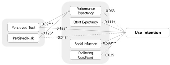 The estimation results from SEM in this study are reported in Table 9 and can be seen in Figure 3. Of the seven measurement factors included in the research model, we found that the independent variables social influence (SI), effort expectancy (EE), and perceived trust (TR) each had significantly positive effects on the dependent variable, i.e., use intention (UI). Meanwhile, perceived trust (TR) and perceived risk (RI) had direct and significant effects on performance expectancy (PE), but performance expectancy (PE) had no significant effect on use intention. Thus, we found no evidence of a mediation effect.