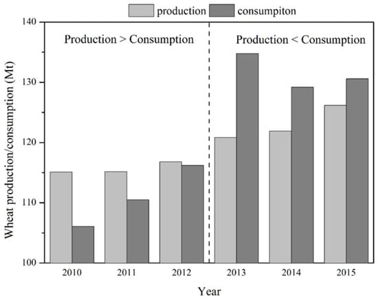 We obtained some data from China National Grain & Oil Information Center, including the annual wheat production, wheat consumption, and their distribution for 31 provinces in China (except Taiwan, Hong Kong, and Macau). The economic information was obtained from the Chinese Statistics Yearbook for 2011–2016.