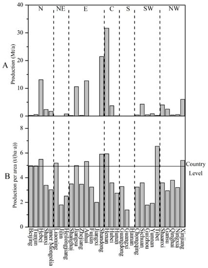 Figure 1 illustrates the total wheat production and consumption in China for the period 2010–2015. The annual wheat production presented an increasing trend from 115.11 Mt/a in 2010 to 126.17 Mt/a in 2015, with an annual yield of 4.92 t/(ha·a). The Huang-Huai-Hai Plain in North China was the main wheat-producing area in China, including Shandong, Anhui, and Jiangsu in East China (E), Henan in Central China (C), and Hebei in North China (N). These five provinces accounted for approximately three-quarters of the total wheat production in China, with an annual yield of more than 10 Mt/a. The remaining provinces produced only one-quarter of the total wheat, mainly in Northeast China, Northwest China, South China, and Southwest China. The wheat yield was only slightly different among provinces in China (Figure 2). For provinces in the Huang-Huai-Hai Plain, their wheat yields were larger than the national average of 4.92 t/(ha·a). However, the wheat yield in Northeast China was much lower than the national average, especially for Heilongjiang (2.51 t/(ha·a)) and Jilin (1.80 t/(ha·a)). The low yield led to lower income there, and consequently, local farmers shifted to planting paddy rice for higher income. Compared with 2010, in 2015, wheat croplands in Heilongjiang and Jilin decreased by 63.50% and 90.24%, respectively.
