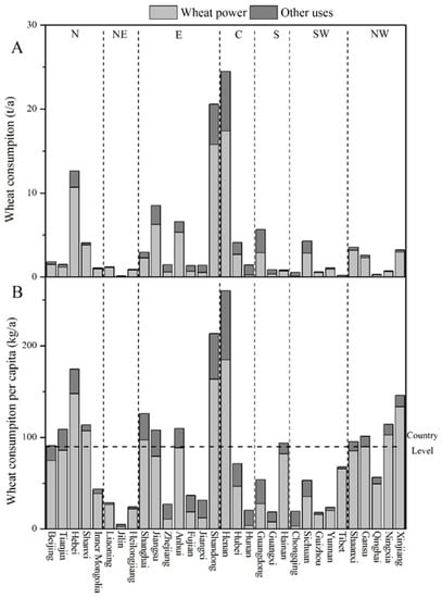The annual wheat consumption amounted to 121.23 Mt/a during the period 2010–2015, approximately 89.90 kg/a per capita. Approximately 90.28 Mt of wheat was consumed annually for producing wheat flour, accounting for 74.47% of total wheat consumption, and the remaining was consumed for other uses (Figure 3). Henan, Shandong, and Hebei were large wheat producers and large wheat consumers in China. For these three provinces, their annual wheat consumption was more than 10 Mt/a, totaling 47.65% of total wheat consumption in China, with more than 70% of wheat consumption being used for wheat flour. Wheat consumption was also large in Jiangsu, Anhui, Guangdong, Sichuan, and Hubei. More specifically, although Guangdong produced only a small amount of wheat, it consumed a great deal of wheat traded from other provinces. There were great differences in wheat uses among 31 provinces due to their distinct geography, climate, culture, and economic level. More than 55% of wheat consumption was used for producing wheat flour in all provinces in North China and Northwest China as well as some provinces in Northeast China and Southwest China. However, more than one-half of the wheat consumption was used for purposes other than wheat flour in Jilin, Zhejiang, Jiangxi, Hunan, Guangdong, Guangxi, and Chongqing. In particular, only 18.41% and 15.47% of wheat consumption was used for producing wheat flour in Hunan and Chongqing, respectively. Due to different cultures, wheat consumption per capita in China presented great spatial differences. Wheat consumption per capita was higher than the national average for all provinces in North China and Northwest China. However, wheat consumption per capita was the largest in Henan, approximately 2.89 times higher than the national average, followed by Shandong (2.37 times higher) and Hebei (1.94 times higher). However, wheat consumption per capita was much lower than the national level in Northeast China, South China, East China (except Shandong), and Central China (except Henan), where rice was the main staple. Therefore, both location and culture have great influences on cereal consumption in China.