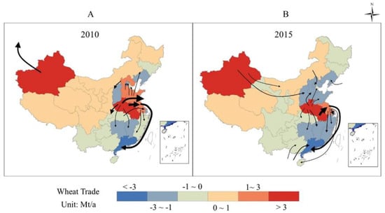 Figure 1 illustrates that both wheat production and wheat consumption presented increasing trends during the period 2010–2015. During the first 3 years of 2010–2012, wheat production exceeded wheat consumption in China, but the net wheat surplus decreased. For the last 3 years, the national wheat consumption was larger than its production, and the deficit of wheat consumption was met by previous wheat stocks or imports from other countries. In 2013, the deficit of wheat consumption amounted to 13.96 Mt/a, accounting for 5.6% of the total national wheat consumption. Based on the CHINAGRO model, we estimated the domestic wheat trade in China for the years 2010 and 2015 (Figure 4). Without wheat stocks and international wheat trade, the annual domestic wheat trade was approximately 19.60 Mt/a in China during the period 2010–2015, accounting for 16.43% of the total national wheat production. In addition, total wheat exports and stocks amounted to 4.77 Mt/a in the first 3 years. However, China annually consumed 8.55 Mt of wheat exported from other countries or from previous stocks for the last 3 years. We compared domestic wheat trade in 2010 and 2015 for more details.