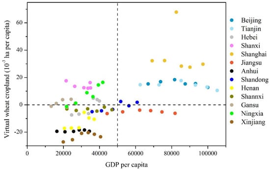 Land use change occurs with economic development [33]. Land prices have been increasing with economic development, and local inhabitants have had to turn to jobs with higher incomes, such as manufacturing. Therefore, cropland may be used for industry. Meanwhile, food consumption may also increase with economic development [34]. However, local food production cannot meet food consumption in these regions, and food must be imported from other regions, leading to virtual cropland transfer. Therefore, it is necessary to determine how virtual cropland transfer is associated with economic development. In China, virtual wheat cropland also presented a similar trend with economic development (Figure 7). With economic development, provinces such as Xinjiang, Henan, and Anhui turned from net virtual wheat cropland exporters to net virtual wheat cropland importers, similar to Beijing, Tianjin, and Shanghai. More specifically, when GDP per capita amounted to more than 50,000 Yuan/a, most provinces presented as net virtual wheat cropland importers, except the main wheat producers such as Jiangsu and Shandong. Although Jiangsu still presented as a net virtual wheat cropland exporter, its export amount showed a decreasing trend with economic development. When GDP per capita was lower than 50,000 Yuan/a, most provinces with wheat production presented as net virtual wheat cropland exporters, but the net import decreased with economic development. The net virtual wheat cropland per capita in Ningxia changed significantly with economic development, from a net exporter to a net importer. Therefore, the net virtual cropland per capita has been greatly influenced by local economic development. Future research should be conducted on how to balance economic development and food production.