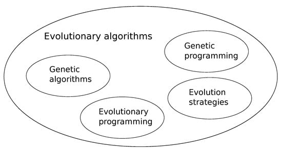 The evolutionary algorithms have been developed for over fifty years [22,23,24,25,26,27,28,29]. During this period, a few different approaches emerged, but all of them shared the same inspiration: Darwin’s theory of evolution [30].