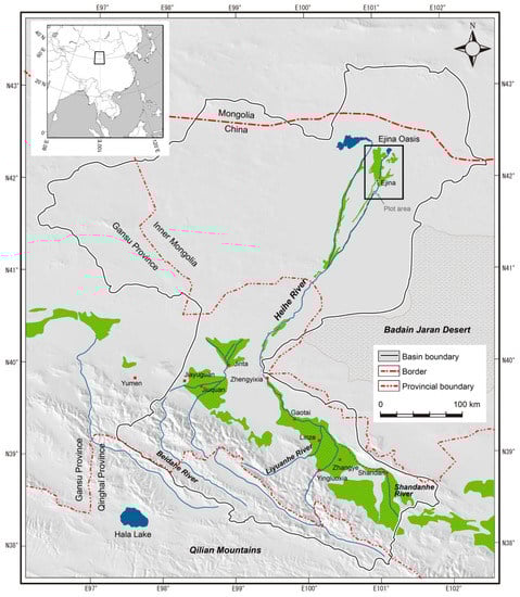 - Si, J.; Feng, Q.; Xi, H.; Chang, Z.; Su, Y. Ejina Desert Oasis: A Fragile “Ecological Screen” in Inland Region of Northwest China. In Proceedings of the 2nd International Conference on Bioinformatics and Biomedical Engineering (ICBBE), Shanghai, China, 16–18 May 2008. [Google Scholar]