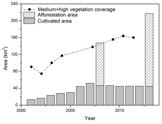 On the other hand, the field survey suggested that afforestation projects may also contribute to the increase of vegetation cover in the lower reaches. In Ejina, total afforestation area reached 101 km2 in 2008, accounting for more than 10% of the total forest area []. This area is equivalent to more than 70% of the total medium and high vegetation cover in 2001 in Ejina (Figure 2). In 2013, the afforestation area increased to 173 km2 [].