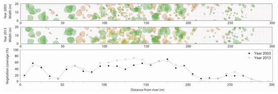 On the other hand, the plot survey also showed an increase of vegetation biomass (Figure 3). From 2003 to 2013, the crown projections indicate a slight increase of total vegetation coverage in the sample plot. The increase includes both predominant perennials, i.e., Populus eupharatica, Tamarix ramosissima, and Achnatherum splendens, and predominant annuals, i.e., Lycium ruthenicum, Ephedra przywalskii, Arnebia fimbriata, Limonium aureum, Reaumuria soongorica, and Peganum harmala (Appendix Figure A2). However, these plants were distributed only 0–300 m away from the river, and in locations of 300 m or further from the river, there were only Gobi plants such as Haloxylon ammodendron. Total vegetation coverage in the plot increased from 28.4% in 2003 to 31.5% in 2013, and the change is especially obvious 100–150 m away from the river. Moreover, three dominant vegetation species illustrated different changing patterns during the period: Achnatherum splendens experienced the greatest increase, Populus euphratica increased moderately, and Tamarix ramosissima changed only slightly.