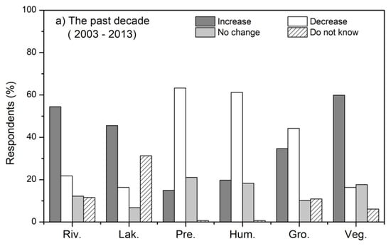 In order to investigate the relationship between responses of the local residents regarding water and vegetation changes from 2003 to 2013, we examined the responses of the 88 individuals who answered that their general impression of the vegetation in Ejina country was on the “increase” during 2003–2013. The local residents in this subset were more likely to respond that increases had occurred in all of the items related to vegetation and water. In particular, 70.5% of the respondents in this subset considered that the river water amount released to Ejina had increased while in comparison, 54.4% of respondents in the full dataset had this perception. Additionally, 54.5% of the subset maintained the perception that Juyan Lake’s water deposits had increased while in comparison, 45.6% of respondents in the full dataset maintained this view.