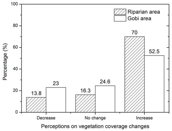 Comparison between respondents who own grasslands in riparian areas and those who own grasslands in Gobi areas on their perceptions to vegetation coverage changes from 2003 to 2013.