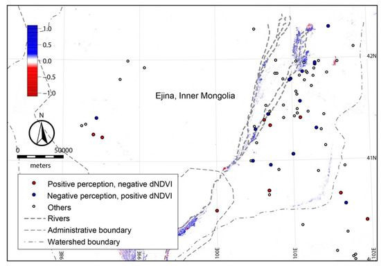 The distance of the respondents’ pasture/farmland from the center of Ejina appears to influence the results of the survey. Figure 5 shows a comparison of perceptions of local ecological changes between the respondents who own pastures and/or farmland in riparian areas and those who own pastures and/or farmland in Gobi areas. Respondents who have pastures and/or farmland in riparian areas are more likely to perceive an “increase” in vegetation changes from 2003 to 2013, while respondents who have pastures and/or farmland in Gobi areas are more likely to perceive a “decrease” or “no change” in vegetation changes from 2003 to 2013. In other words, local residents living in the riparian areas tend to recognize a positive impact of SCMPH, whereas those living in the Gobi areas may actually perceive a negative impact. Figure 6 shows a comparison between the actual changes in vegetation coverage measured by dNDVI and the changes perceived by the respondents at the same location. The red dots indicate the areas where nine respondents perceived an increase in vegetation coverage throughout the past decade despite a negative dNDVI. The blue dots indicate the areas where 16 respondents perceived a decrease in vegetation coverage despite a positive dNDVI.