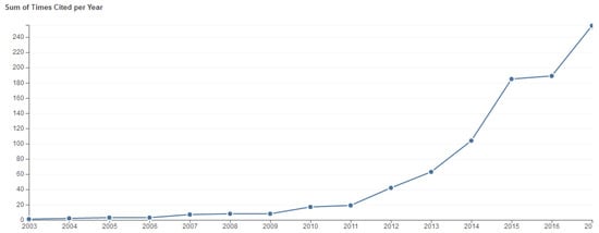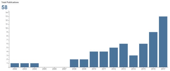 By searching for the topic “environmental information disclosure”, we obtained the 58 publications. The publication numbers per year, obtained using the “Create Citation Report” function of the Web of Science, are presented in Figure 1, which illustrates an increasing tendency in the numbers of publications per year. The resulting numbers of citations per year are shown as Figure 2, which illustrates an obvious increasing tendency. Therefore, this research field is drawing more and more academic attention.