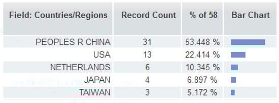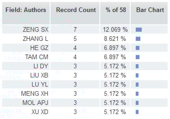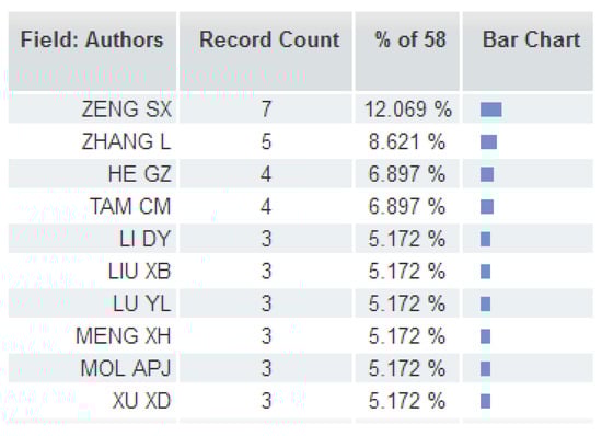 By analyzing via using the “Analyze Results” function of the Web of Science, and pre-setting the minimum record count (threshold) to 3, the resultant top field categories of Web of Science were obtained (shown in Figure 3). This presents an outline of the major disciplines relevant to EID issues. The resulting top countries/regions in terms of publication numbers are shown in Figure 4, which shows that People’s Republic of China ranks first in this list. The top authors in terms of numbers of publications are shown in Figure 5, which indicates that most are Chinese authors. These results partially imply numerous problems related to EID in China. The top journals, in terms of publication numbers, are shown in Figure 6; the top authors in terms of publication numbers are shown in Figure 7; information on the top ten papers in terms of numbers of citations (from Web of Science Core Collection) is shown in Table 1. Such information may help readers to get a basic understanding upon this research direction.