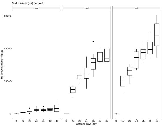 A total of seven samples of soils and leaves were collected and analyzed. In addition, 11 mandarin oranges were harvested and processed at the end of the experiment. The vector of watering days is w = (0, 20, 26, 31, 35, 39, 43). Thus, w = 0 represents the baseline (control) concentrations of Ba, Cr, Pb, and Ag in the soil and leaves at the start of the experiment, i.e., when no heavy metal irrigation water had been applied yet, while w = 26 refers to the concentrations measured after 26 waterings. Analysis of covariance (ANCOVA) was carried out to model the change in measured metal concentrations in both the soil and leaf samples as a function of the heavy metal concentration in the irrigation water (the treatment) while controlling for waterings (w). Analysis of variance (ANOVA) was used to estimate the effects of the irrigation water concentrations on the pith, peel, and juice of the fruit. Since the sampling design was not fully balanced (the low concentration level had only seven mandarin orange plants), type II and III sums of squares were used [29]. Tukey’s honest significant difference test (Tukey HSD) was applied to identify differences in means between factor level combinations. All analyses were carried out in the R statistical language and computing environment, version 3.4.3 [30]. Results are presented by metal.