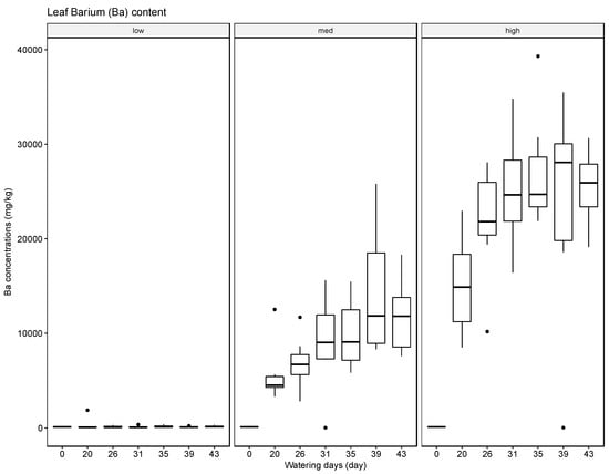 Boxplots of measured concentrations of Ba in the leaves as a function of Ba concentration in the irrigation water (low, medium, high) and watering day, w.