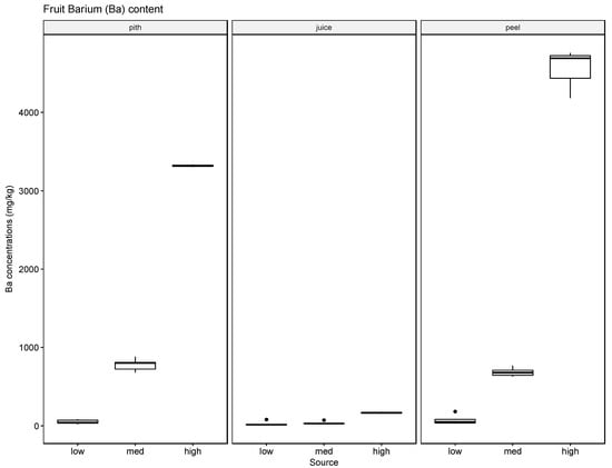 Ba concentrations in the fruit (Figure 3) were highest for the peel (mean = 1014.2 mg/kg, SD = 1654.1 mg/kg) and pith (mean = 834.0 mg/kg, SD = 1193.2 mg/kg). At the high watering concentration, the peel had a mean concentration of 4544.3 mg/kg (SD = 315.5 mg/kg), and the pith a mean of 3318.4 mg/kg (SD = 16.8 mg/kg). Concentrations of Ba in the juice remained low regardless of the concentration of Ba in the irrigation water (mean = 52.8 mg/kg, SD = 56.1 mg/kg). The ANOVA results of the effect of Ba watering concentrations and fruit type (peel, pith, and juice) shown in Table 4 indicate that both are highly significant and that the effect of treatment depends on the type of fruit analyzed.