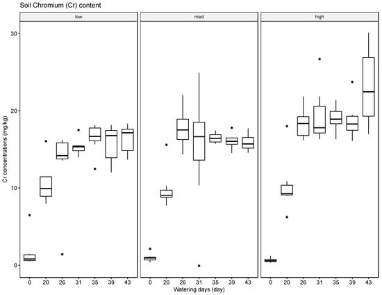 The measurements for total Cr in the soil show an increase with watering days, w, that levels off at w = 26. As the boxplots in Figure 4 illustrate, the variation in measured concentrations also increased with w (SDw=0 = 1.2 mg/kg and SDw=43 = 5.7 mg/kg). There was little to no differentiation in soil accumulation between the three tested irrigation water concentrations.