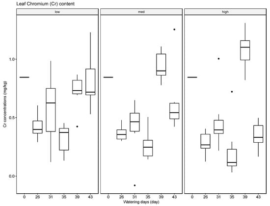 Boxplots of measured concentrations of total Cr in the leaves as a function of Cr(III) concentration in the irrigation water (low, medium, high) and watering day, w.