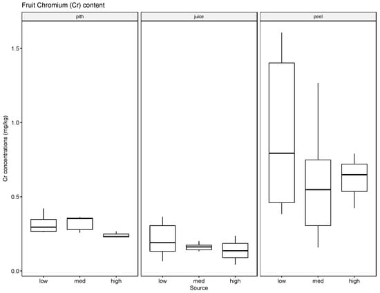 Boxplots of measured concentrations of total Cr in the pith, juice, and peel portions of the harvested mandarin oranges as a function of Cr(III) concentration in the irrigation water (low, medium, high).